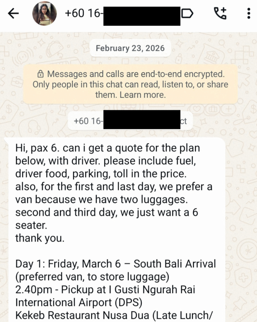 We are a community of selected drivers in Bali, so your trip is always covered by our team and runs smoothly.